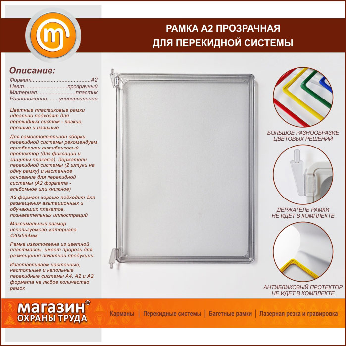 - Для самостоятельной сборки перекидной системы рекомендуем приобрести антибликовый протектор (для фиксации и защиты плаката), держатели перекидной системы (2 штуки на одну рамку) и настенное основание для перекидной системы (А2 формата - альбомное или книжное)