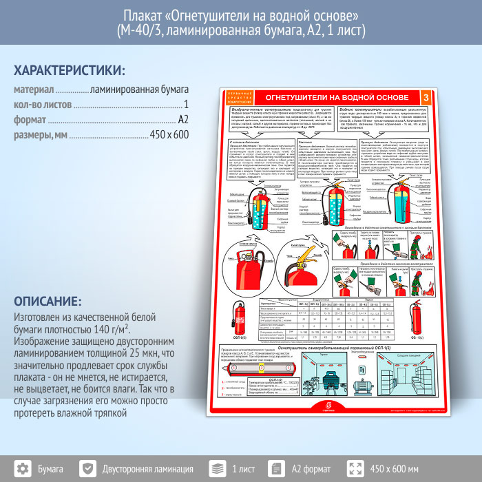 Плакат «Огнетушители на водной основе» (М-40/3, ламинированная бумага, А2, 1 лист) в Тюмени купить