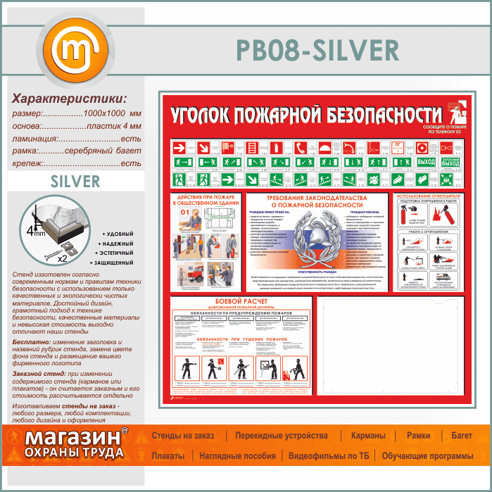 Стенд «Уголок пожарной безопасности» с карманом А3 формата (PB-08-SILVER) в Тюмени купить