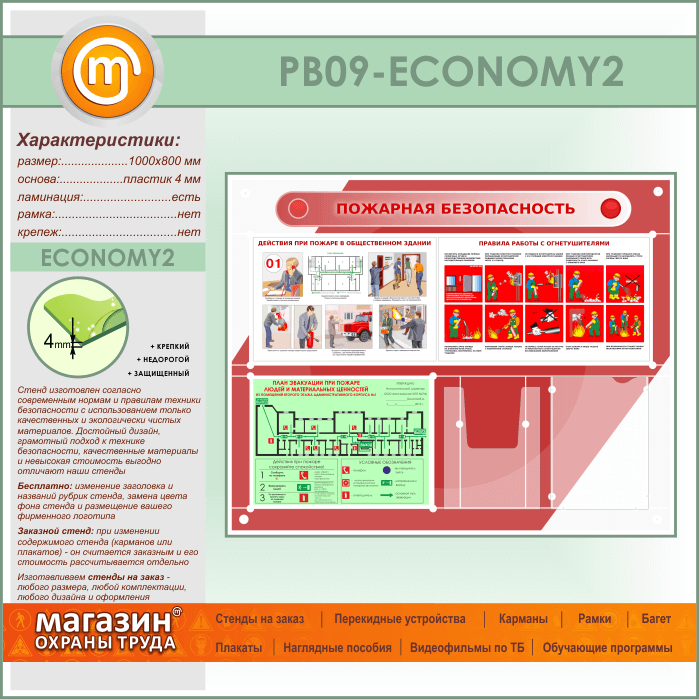 Стенд «Пожарная безопасность» с планом эвакуации, плоским и объемным карманами (PB-09-ECONOMY2) в Тюмени купить