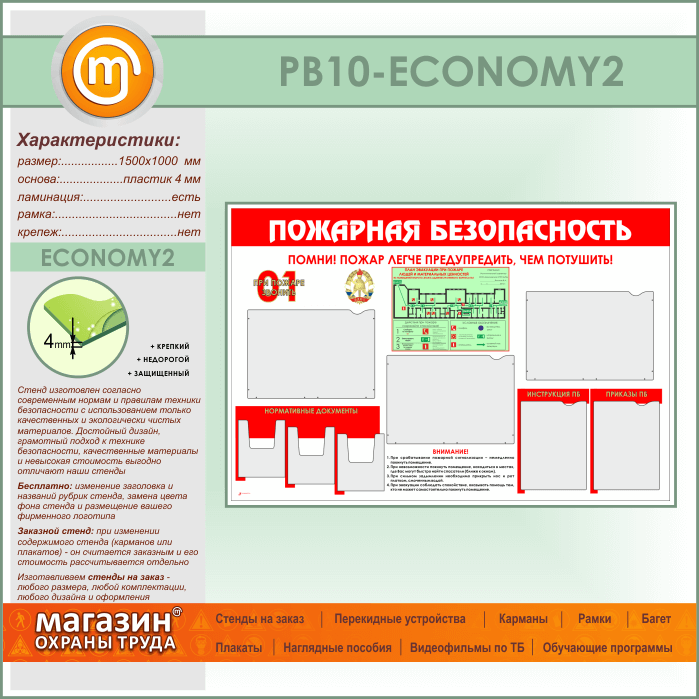 Стенд «Пожарная безопасность» с планом эвакуации, 5 плоскими и 3 объемными карманами (PB-10-ECONOMY2) в Тюмени купить