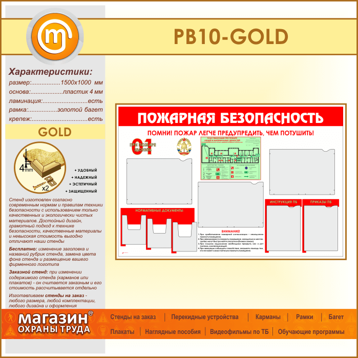 Стенд «Пожарная безопасность» с планом эвакуации, 5 плоскими и 3 объемными карманами (PB-10-GOLD) в Тюмени купить