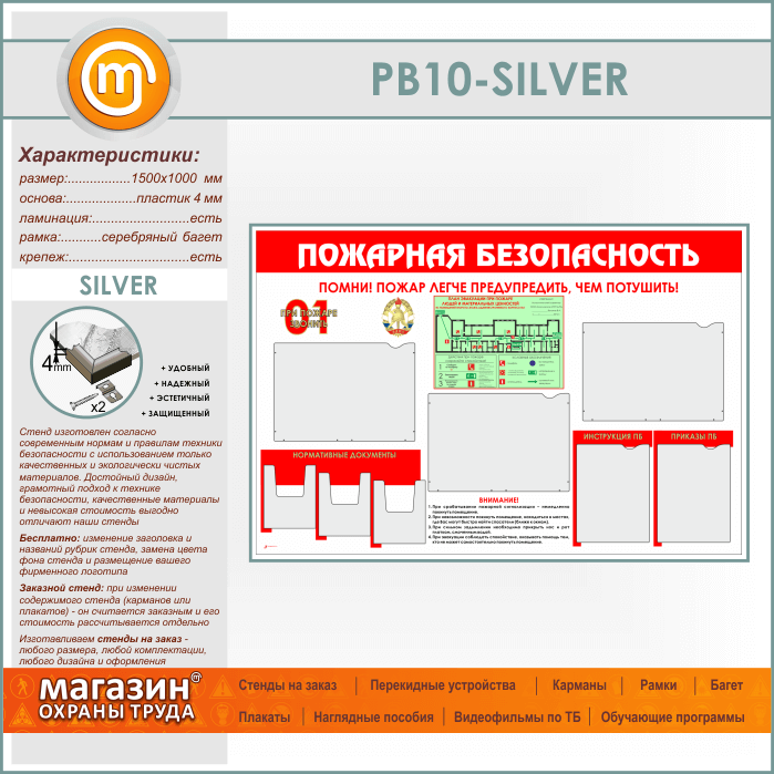 Стенд «Пожарная безопасность» с планом эвакуации, 5 плоскими и 3 объемными карманами (PB-10-SILVER) в Тюмени купить