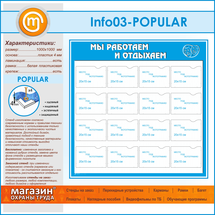 Стенд «Мы работаем и отдыхаем» состоит из 16 плоских карманов А5 формата горизонтального (альбомного) расположения для удобства размещения интересных фотографий Вас и Ваших сотрудников, анонса важных мероприятий…