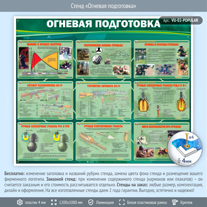 Стенд «Огневая подготовка» (VU-02) разработан в соответствии с Федеральным законом «О воинской обязанности и военной службе», Положением о подготовке граждан Российской Федерации к военной службе, Концепцией патриотического воспитания граждан РФ, тематическим планом раздела ОБЖ «Основы военной службы». На стенде раскрываются теоретические основы стрельбы, явление и процесс выстрела, приемы и способы стрельбы, предназначение и устройство РПК-74 и АК-74, ручных осколочных гранат РГД-5 и Ф-1, а также гранат РГО и РГН, меры безопасности при стрельбе.