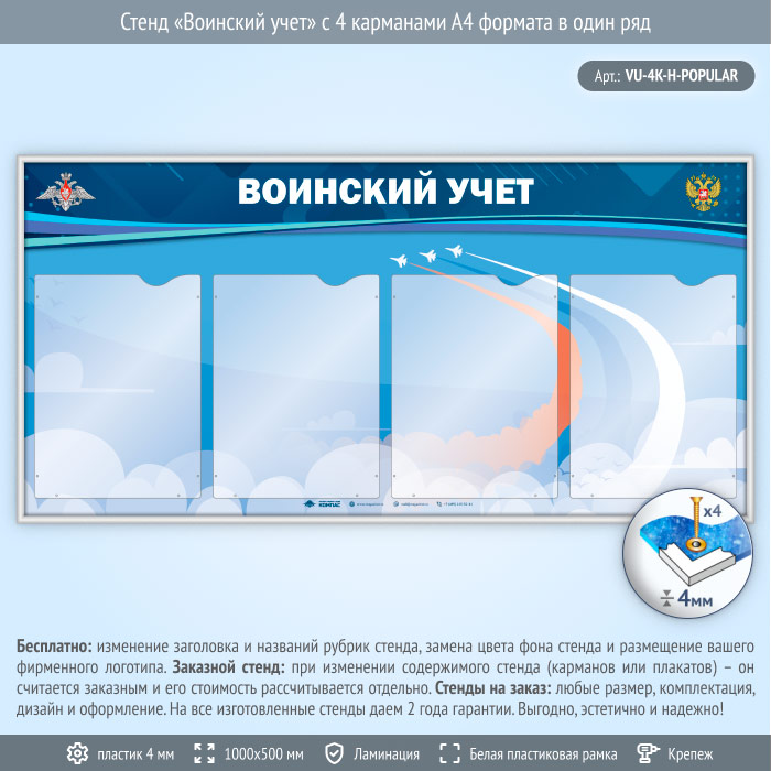 Стенд «Воинский учет» с 4 карманами А4 формата в один ряд (VU-4K-H)