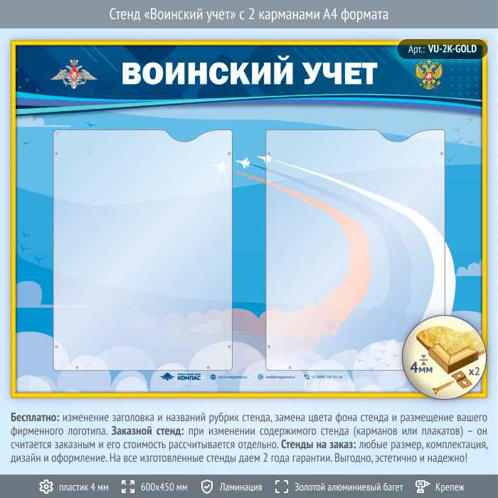 Стенд «Воинский учет» с 2 карманами А4 формата (VU-2K-GOLD) в Тюмени купить