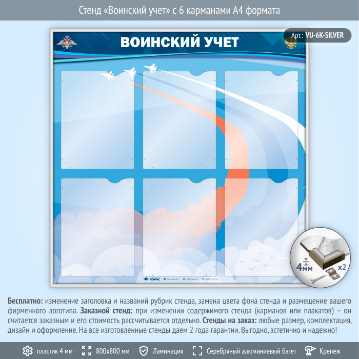 Стенд «Воинский учет» с 6 карманами А4 формата (VU-6K-SILVER) в Тюмени купить