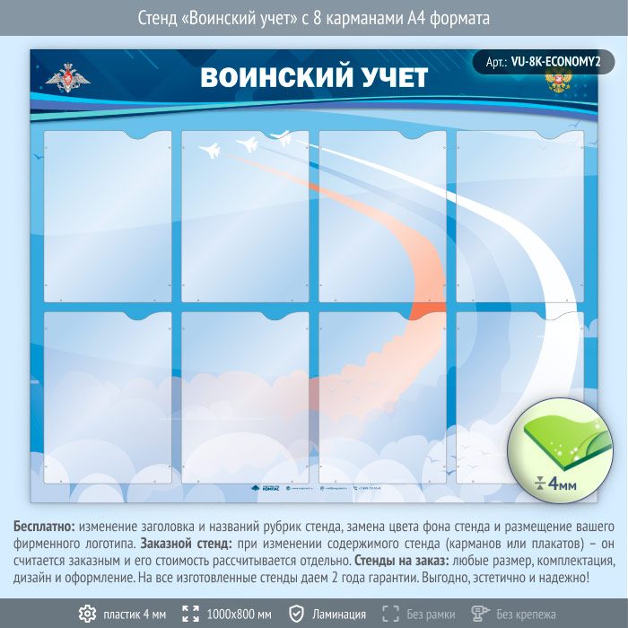 Стенд «Воинский учет» с 8 карманами А4 формата (VU-8K-ECONOMY2) в Тюмени купить