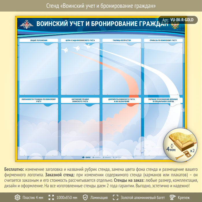 Стенд «Воинский учет и бронирование граждан» с 8 карманами А4 формата (VU-8K-R-GOLD) в Тюмени купить