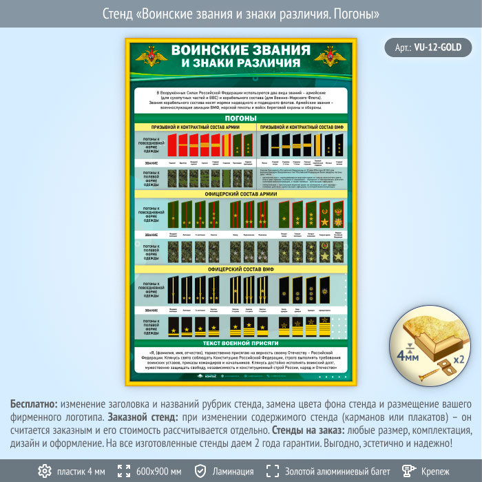 Стенд «Воинские звания и знаки различия. Погоны» (VU-12-GOLD) в Тюмени купить