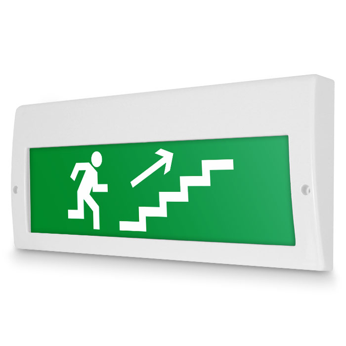 Световое табло «Направление к эвакуационному выходу по лестнице вверх (правосторонний)», Молния (220В РИП) в Тюмени купить