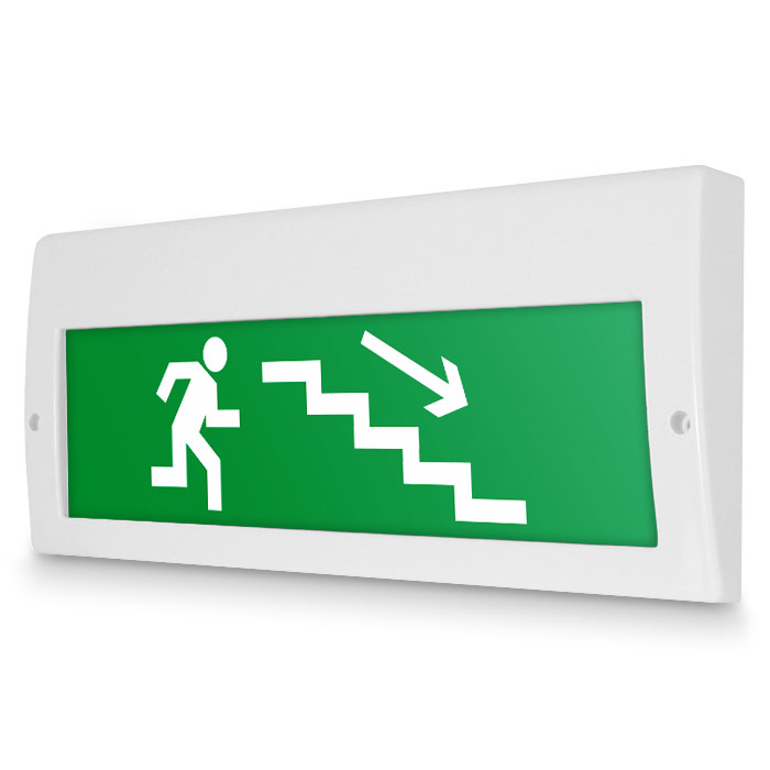 Световое табло «Направление к эвакуационному выходу по лестнице вниз (правосторонний)», Молния (220В РИП) в Тюмени купить