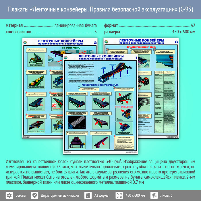 Плакаты «Ленточные конвейеры. Правила безопасной эксплуатации» (С-93, ламинированная бумага, А2, 3 листа) в Тюмени купить