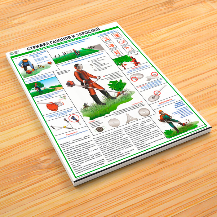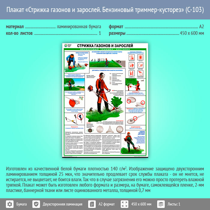 Плакат «Стрижка газонов и зарослей. Бензиновый триммер-кусторез» (С-103, ламинированная бумага, А2, 1 лист) в Тюмени купить