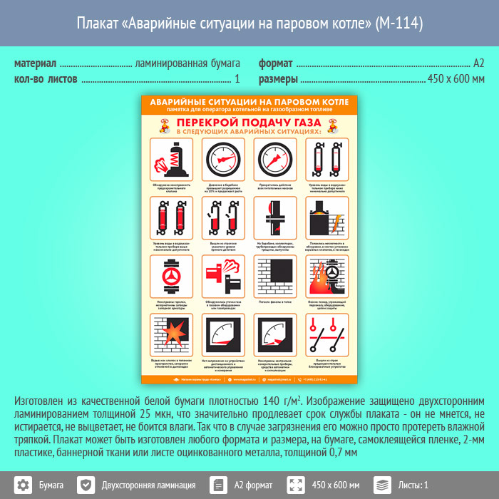 Плакат «Аварийные ситуации на паровом котле» (М-114, ламинированная бумага, А2, 1 лист) в Тюмени купить