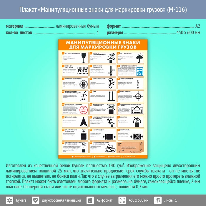 Плакат «Манипуляционные знаки для маркировки грузов» (М-116, ламинированная бумага, А2, 1 лист) в Тюмени купить