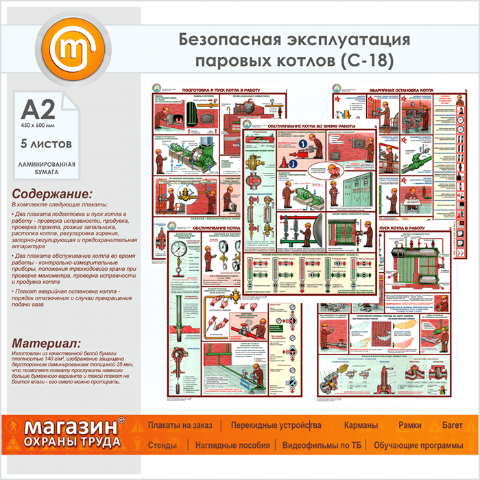 Плакаты «Безопасная эксплуатация паровых котлов» (С-18, ламинированная бумага, А2, 5 листов) в Тюмени купить