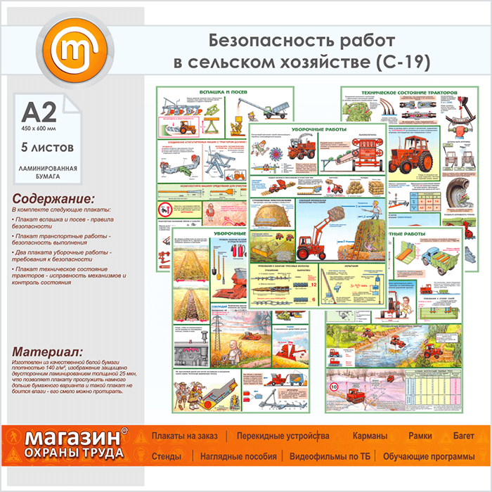 Плакаты «Безопасность работ в сельском хозяйстве» (С-19, ламинированная бумага, А2, 5 листов) в Тюмени купить