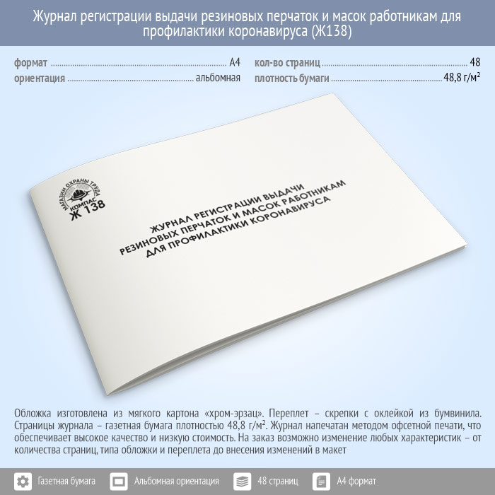 Журнал регистрации выдачи резиновых перчаток и масок работникам для профилактики коронавируса (48 стр., Ж138) в Тюмени купить