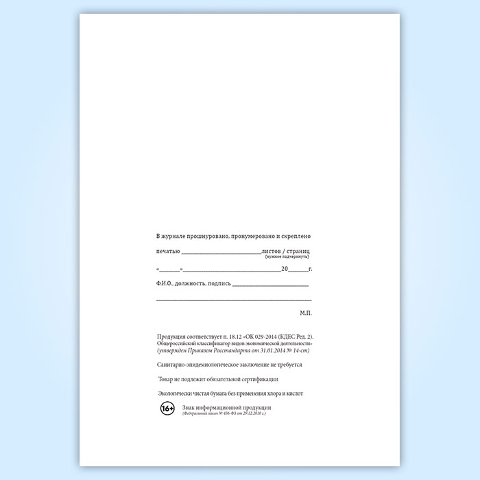 Вы получаете печатную продукцию прошнурованной и c местом для вашей печати в соответствии с действующими нормативными документами: