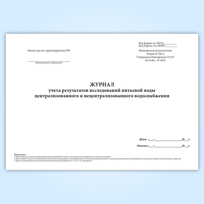 Журнал учета результатов исследований питьевой воды централизованного и нецентрализованного водоснабжения (форма 326-у) в Тюмени купить