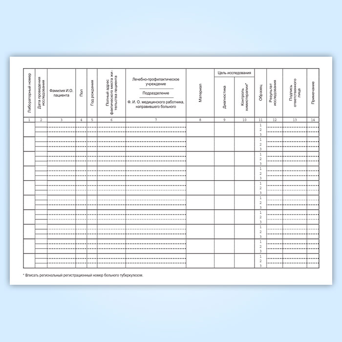 Журнал регистрации диагностического материала, собранного для микроскопических исследований на туберкулез (форма № 04-1-ТБ/у) в Тюмени купить