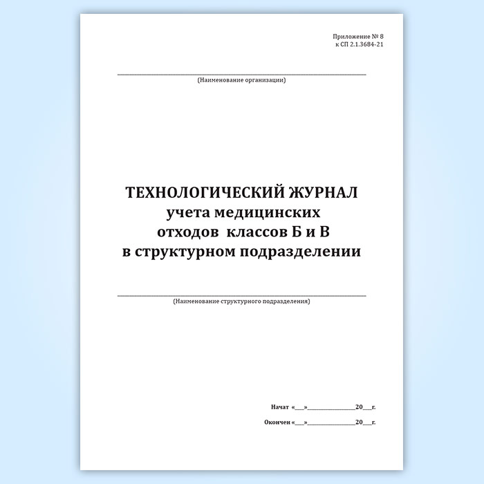 Технологический журнал учета медицинских отходов классов Б и В в структурном подразделении в Тюмени купить