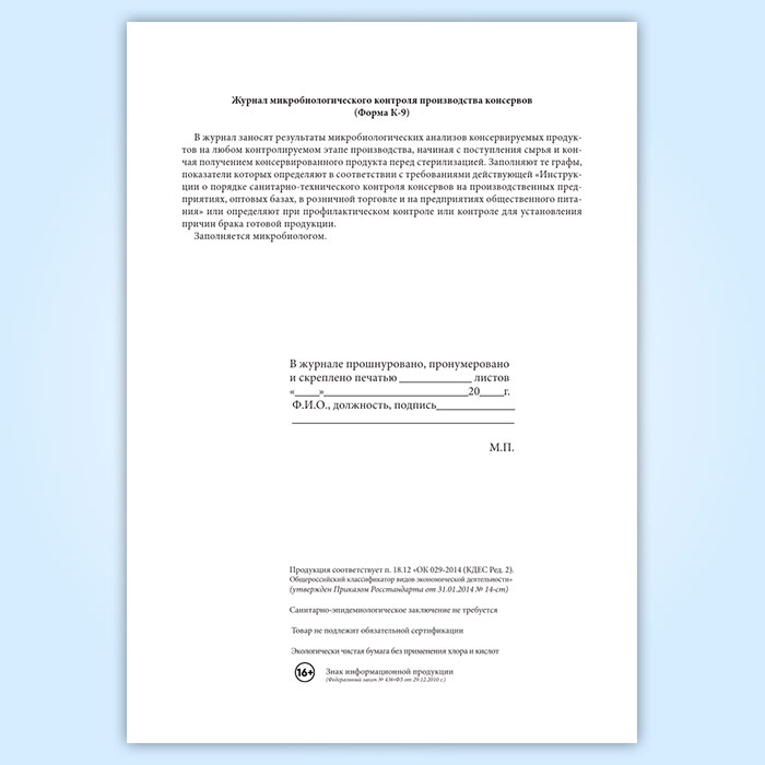 Журнал микробиологического контроля производства консервов (форма К-9) в Тюмени купить