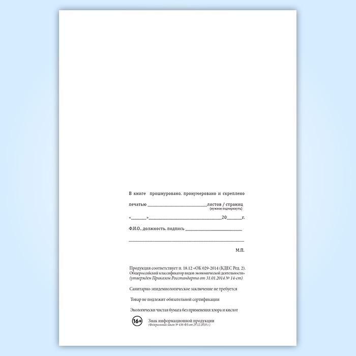 Вы получаете печатную продукцию прошнурованной и c местом для вашей печати в соответствии с действующими нормативными документами: