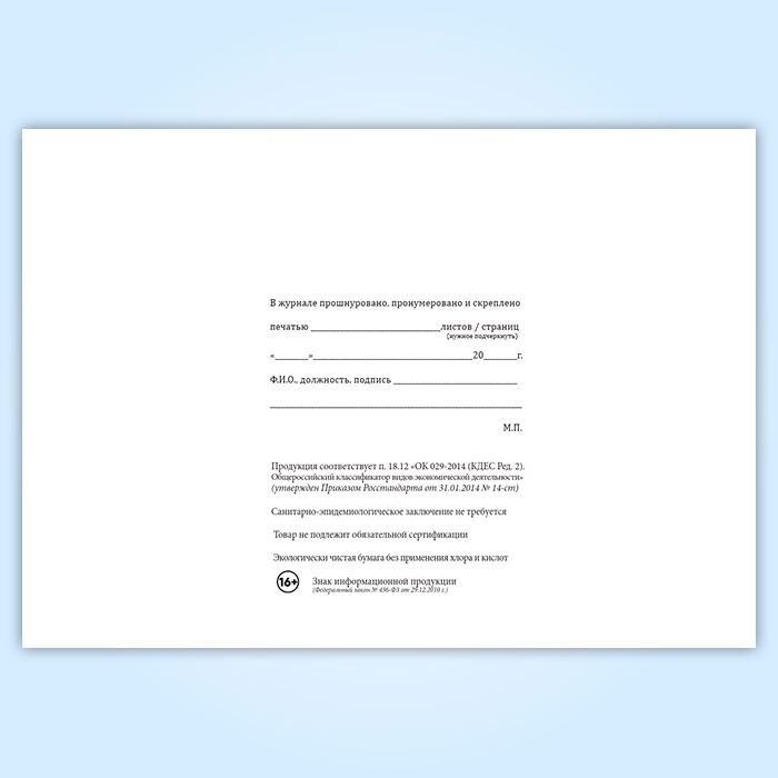 Вы получаете печатную продукцию прошнурованной и c местом для вашей печати в соответствии с действующими нормативными документами: