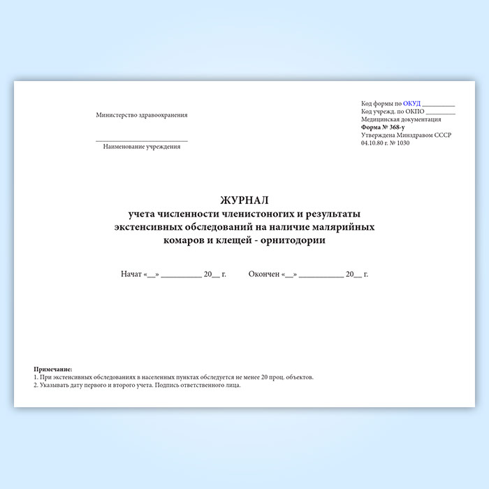 Журнал учета численности членистоногих и результаты экстенсивных обследований на наличие малярийных комаров и клещей - орнитодории (форма № 368-у) в Тюмени купить