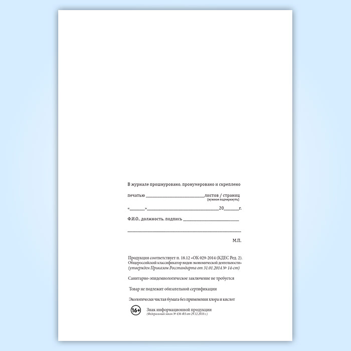 Вы получаете печатную продукцию прошнурованной и c местом для вашей печати в соответствии с действующими нормативными документами: