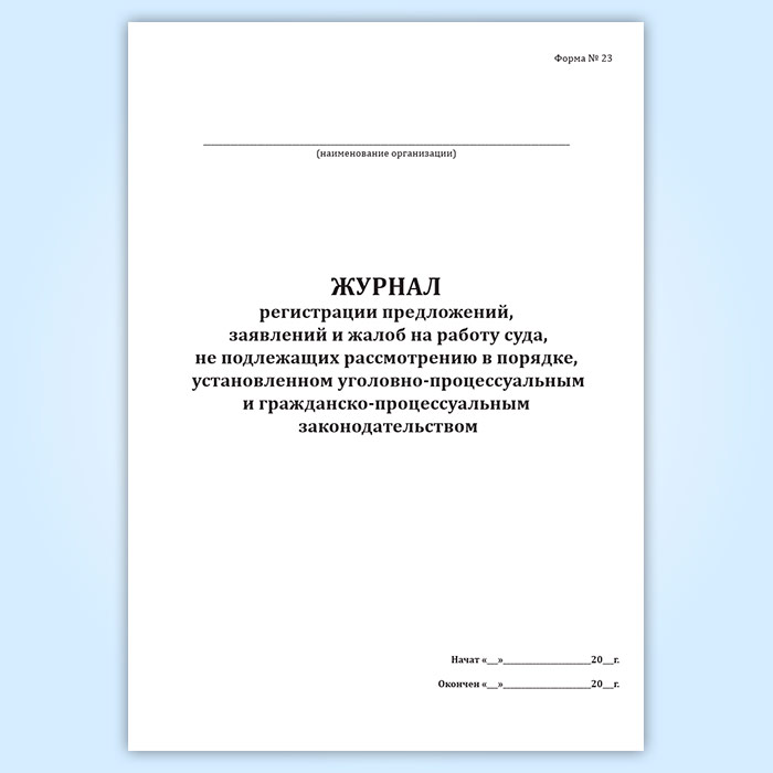 Журнал регистрации предложений, заявлений и жалоб на работу суда, не подлежащих рассмотрению в порядке, установленном уголовно-процессуальным и гражданско-процессуальным законодательством (форма № 23) в Тюмени купить