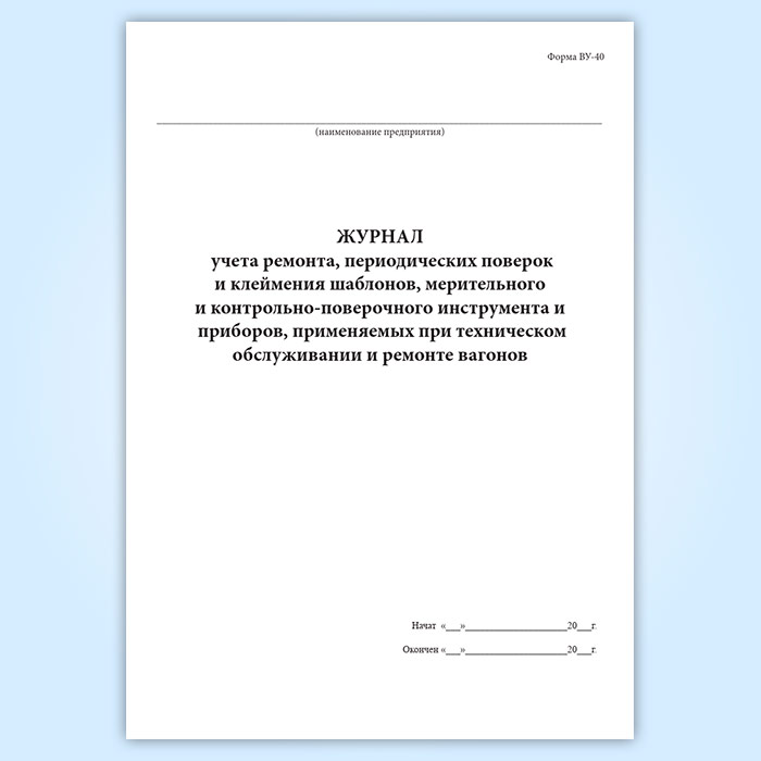 Журнал учета ремонта, периодических поверок и клеймения шаблонов, мерительного и контрольно-поверочного инструмента и приборов, применяемых при техническом обслуживании и ремонте вагонов (форма ВУ-40) в Тюмени купить