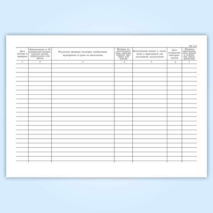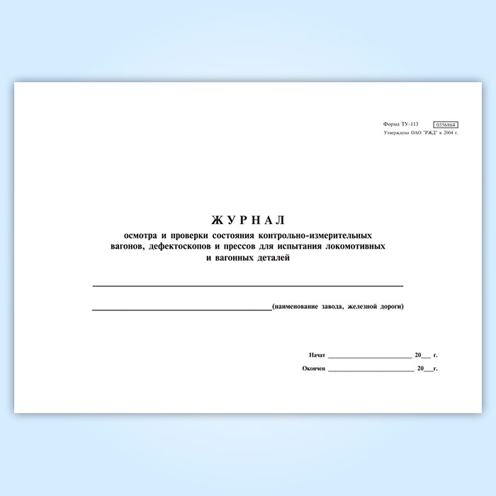 Журнал осмотра и проверки состояния контрольно-измерительных вагонов, дефектоскопов и прессов для испытания локомотивных и вагонных деталей (форма ТУ-113) в Тюмени купить