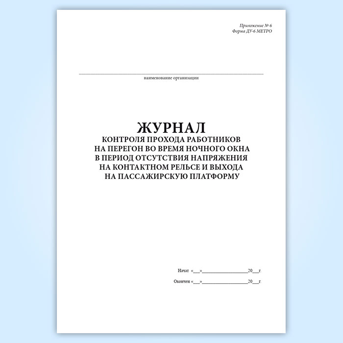 Журнал контроля прохода работников на перегон во время ночного окна в период отсутствия напряжения на контактном рельсе и выхода на пассажирскую платформу (форма ДУ-6 МЕТРО) в Тюмени купить