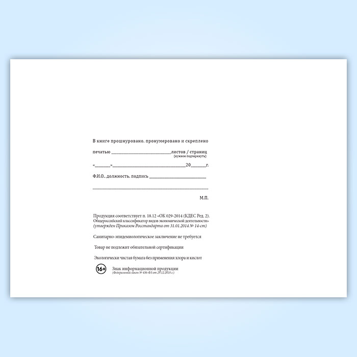 Вы получаете печатную продукцию прошнурованной и c местом для вашей печати в соответствии с действующими нормативными документами: