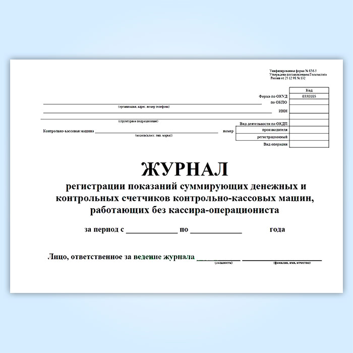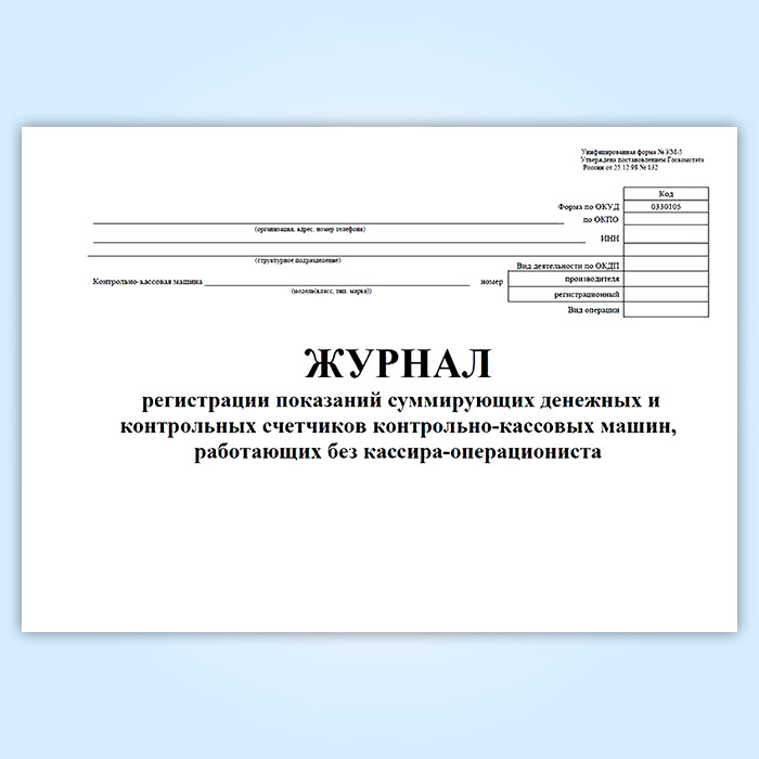 Журнал регистрации показаний суммирующих денежных и контрольных счетчиков контрольно-кассовых машин, работающих без кассира-операциониста (форма КМ-5) в Тюмени купить