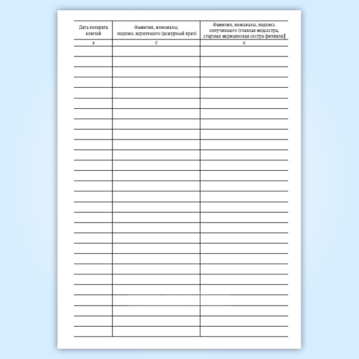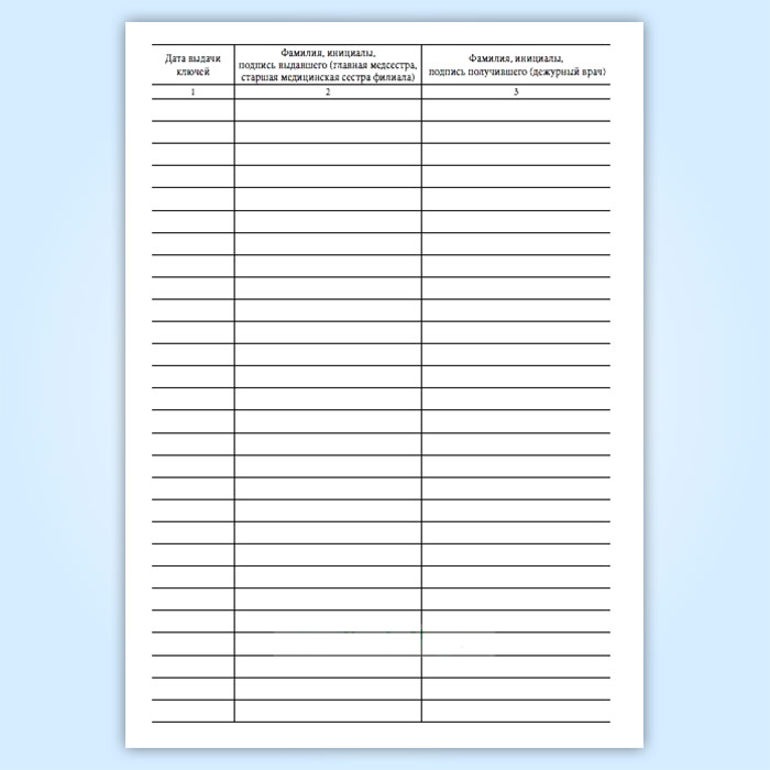 Журнал передачи ключей главной медсестры (старшей медицинской сестры филиала) дежурным врачам от помещения и сейфа, где проводятся операции, связанные с оборотом наркотических средств и психотропных веществ, в выходные и праздничные дни в амбулаторном отделении медицинской организации в Тюмени купить