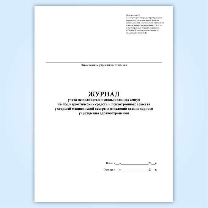 Журнал учета не полностью использованных ампул из-под наркотических средств и психотропных веществ у старшей медицинской сестры в отделении стационарного учреждения здравоохранения в Тюмени купить