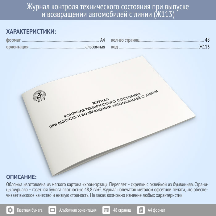 Журнал контроля технического состояния при выпуске и возвращении автомобилей с линии (48 стр., Ж113) в Тюмени купить